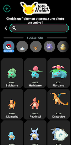 1. Выберите предпочтительных покемонов и тех, кого вы хотите увидеть на фотографии. Vous ne l’avez pas attrapé? Па де паника! Presque tous les Pokémon du jeu sont disponibles*.